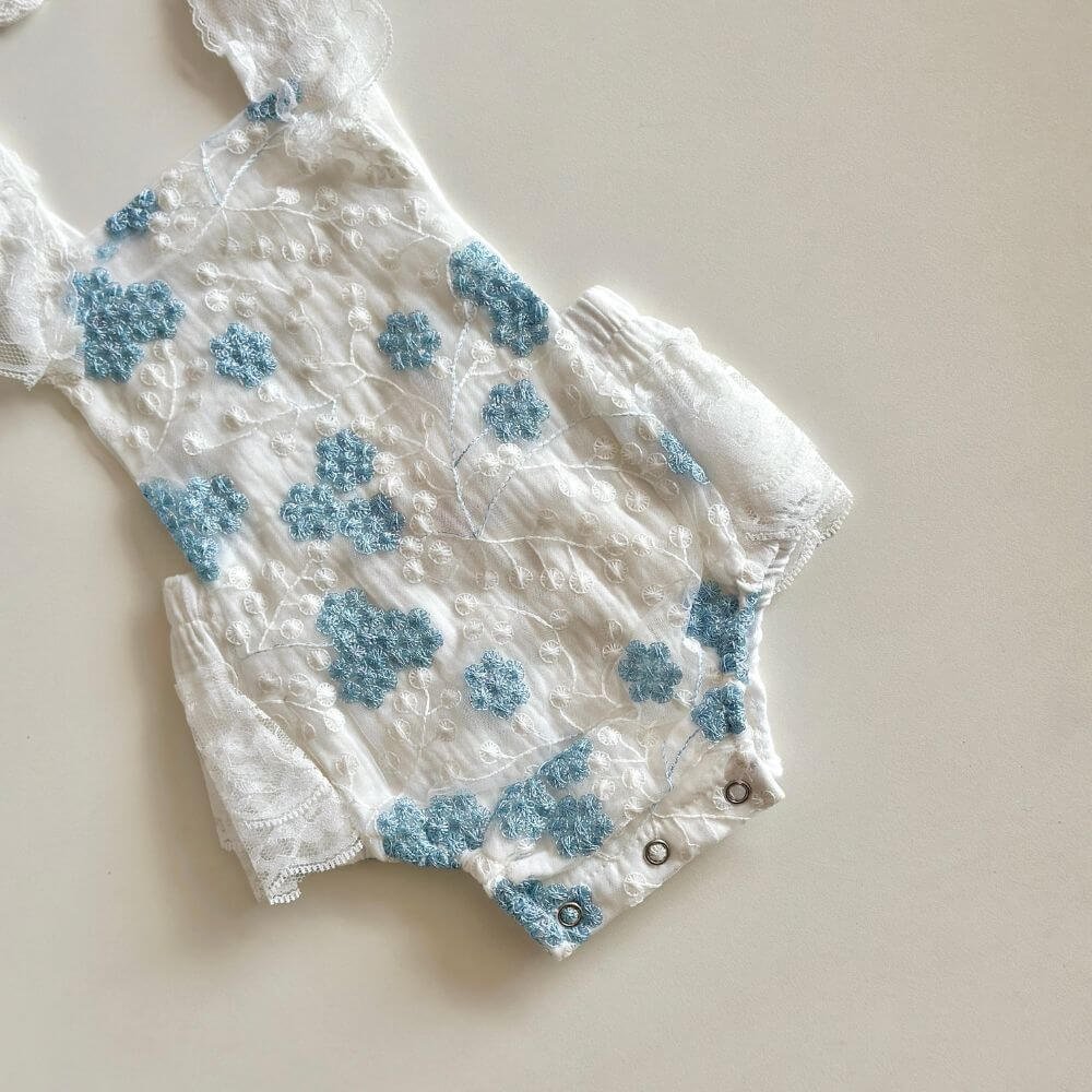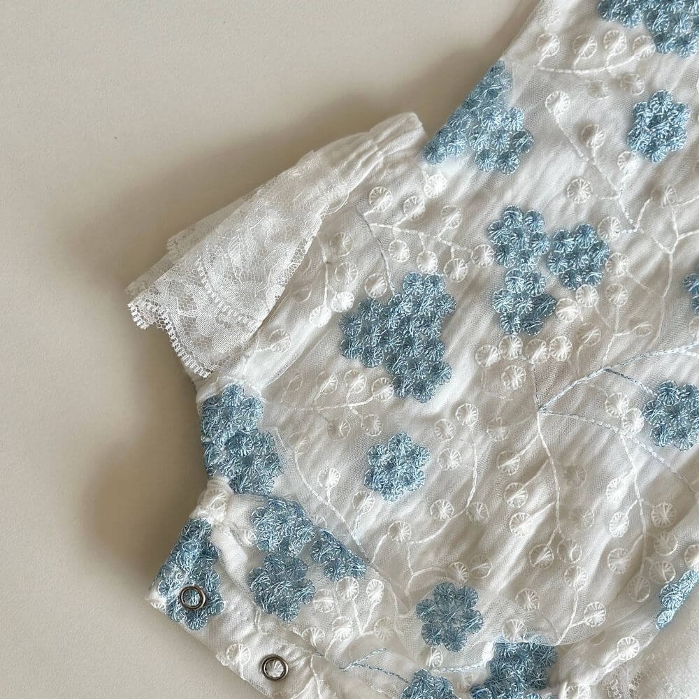 Adorned with a delicate floral pattern and intricate lace details, this piece exudes timeless charm. The ruffled design on the front and sleeves adds an elegance, perfect for special occasions or everyday sweetness.
