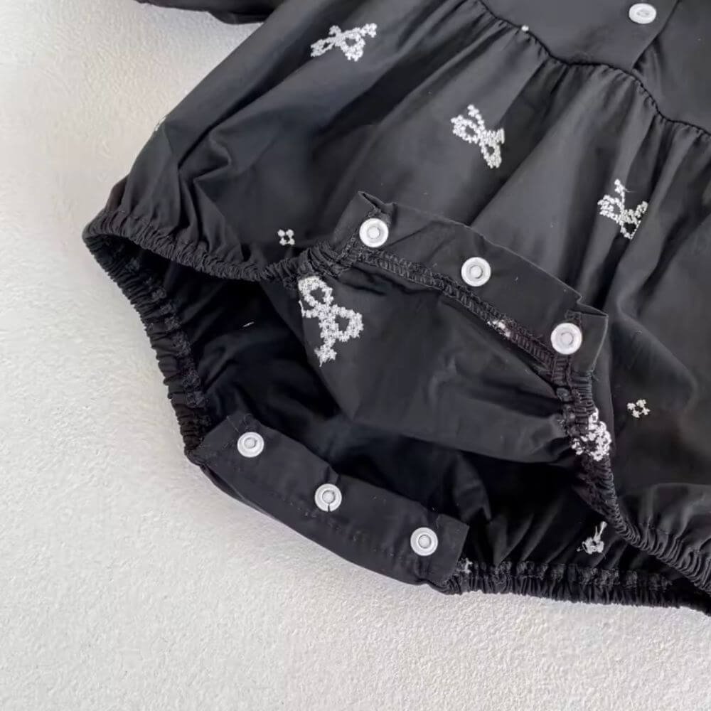 Darcy romper features a classic Peter Pan collar, puffy sleeves, and delicate white lace trims. Adorned with tiny bows, it’s made from lightweight fabric for all-day comfort perfect for everyday wear or special occasions. (Headband and Socks NOT INCLUDED)