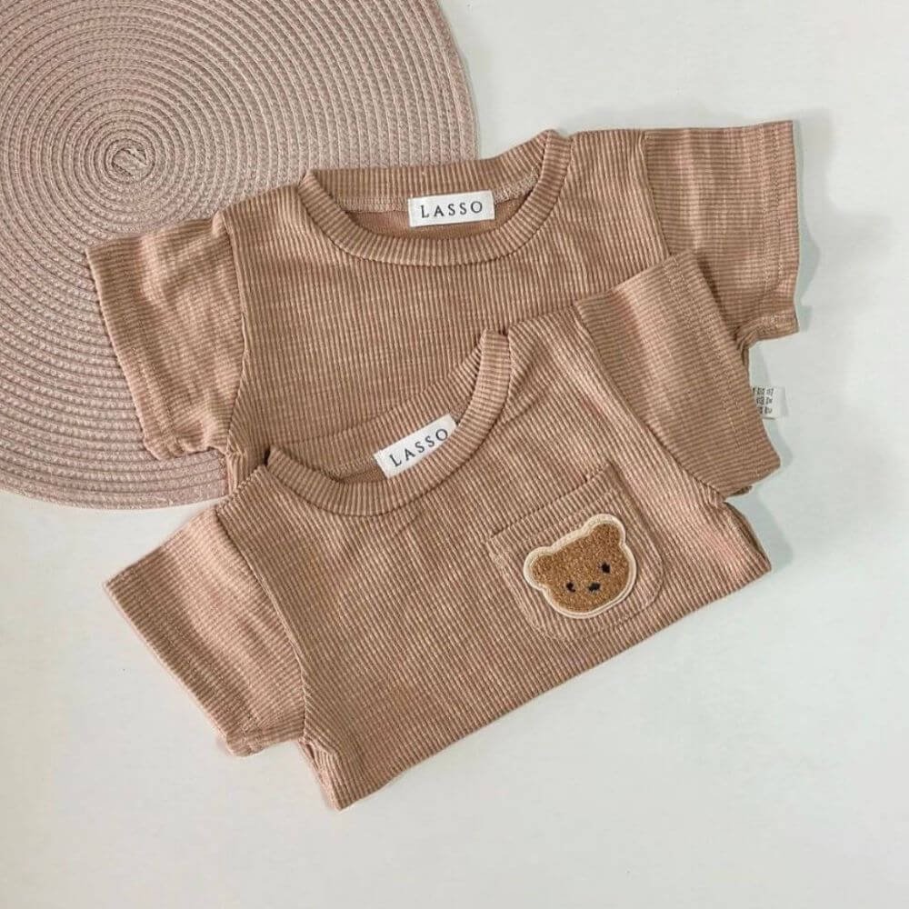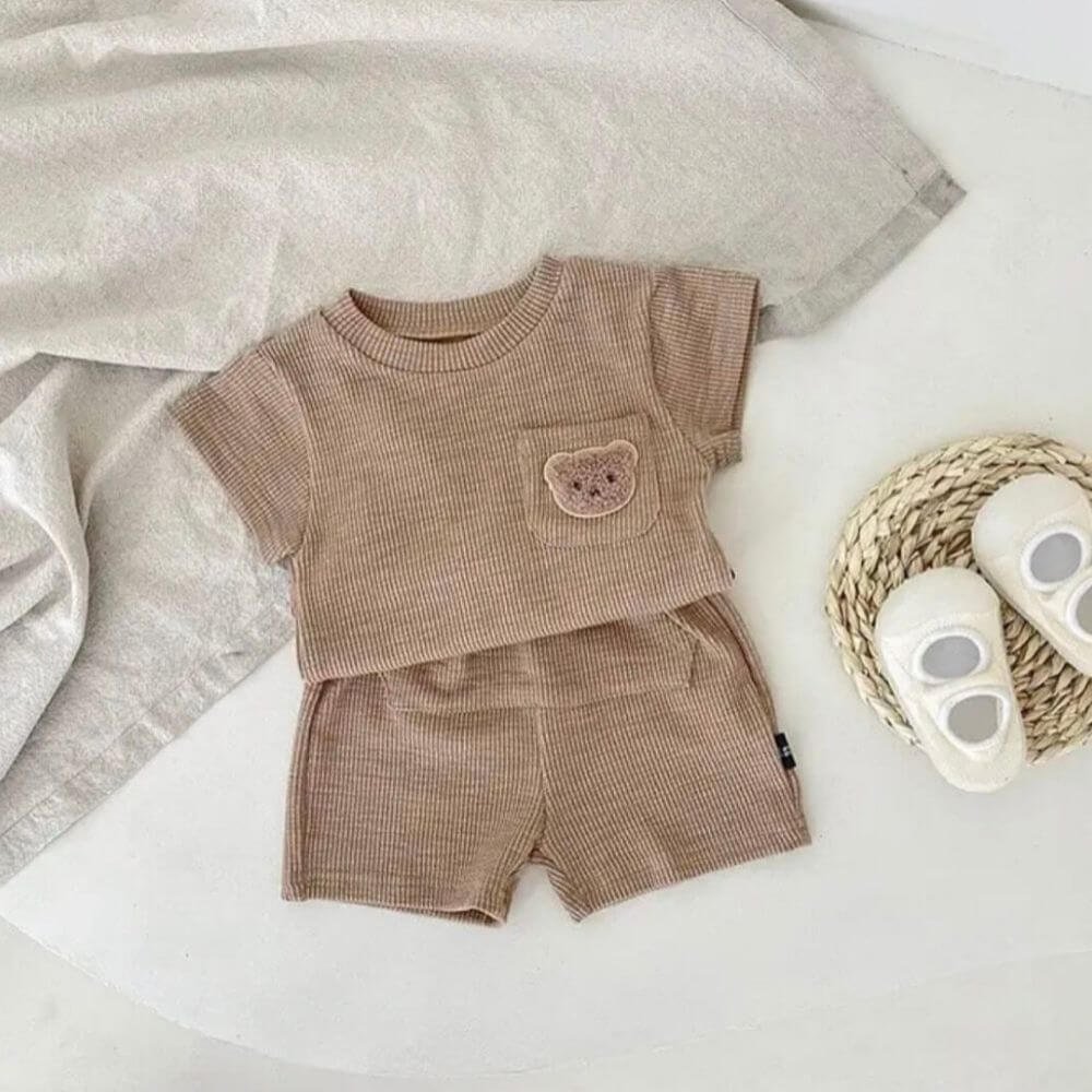The DENVER set is a cozy 2-piece outfit featuring a t-shirt and matching shorts, made from soft, baby-friendly cotton. Designed with subtle self-stripes and a cute teddy peeking out of the pocket, it’s perfect for everyday comfort and charm.