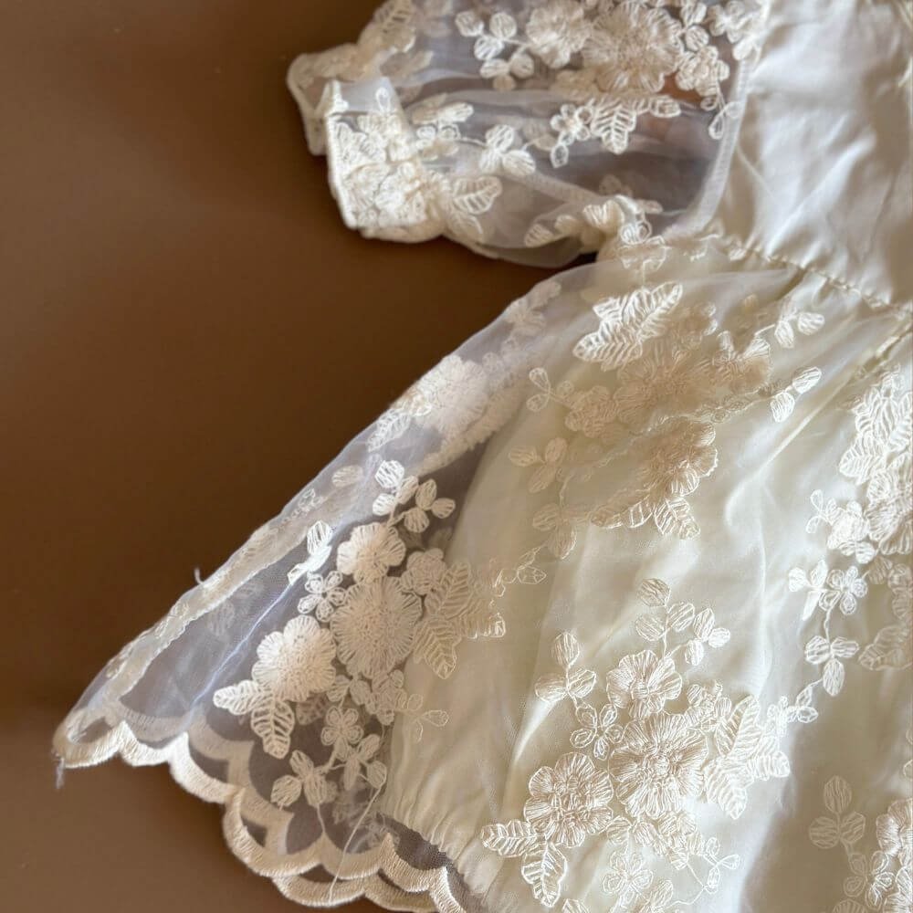 Eden Lace romper is crafted from soft, breathable cotton and adorned with a delicate floral pattern that adds charm and grace. Featuring exquisite lace embroidery layering details and a back-buttoned closure for easy dressing, it’s designed to make every moment special. Perfect for baptisms, birthdays, or any cherished occasion.