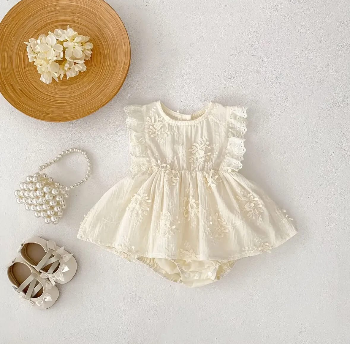 The Edwige Romper is a beautiful piece featuring intricate floral embroidery and delicate lace trim. With its flutter sleeves and flowy silhouette, it’s perfect for any special occasion or photoshoot. This romper effortlessly combines style and comfort, making it a standout addition to your little one’s wardrobe. Measurements- (0-6M-chest 26cm,length-36cm) (6-12M-chest 28cm,length-40cm)