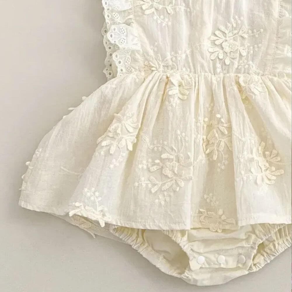 The Edwige Romper is a beautiful piece featuring intricate floral embroidery and delicate lace trim. With its flutter sleeves and flowy silhouette, it’s perfect for any special occasion or photoshoot. This romper effortlessly combines style and comfort, making it a standout addition to your little one’s wardrobe. Measurements- (0-6M-chest 26cm,length-36cm) (6-12M-chest 28cm,length-40cm)