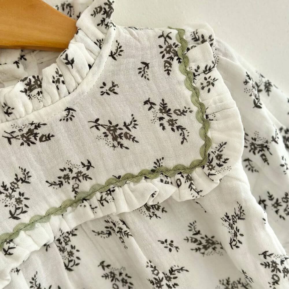 A charming romper featuring a beautiful floral pattern, perfect for your little one. Designed with long sleeves and a round neckline, this piece is elevated with delicate ruffle detailing around the collar and chest, adding a touch of timeless elegance.