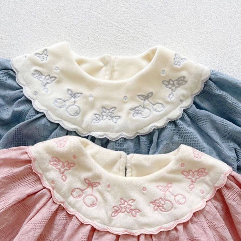 A long-sleeved baby romperwith a white Peter Pan collar and a matching bonnet. The romper features a subtle pattern of lines and shapes, adding texture and visual interest to the overall design.