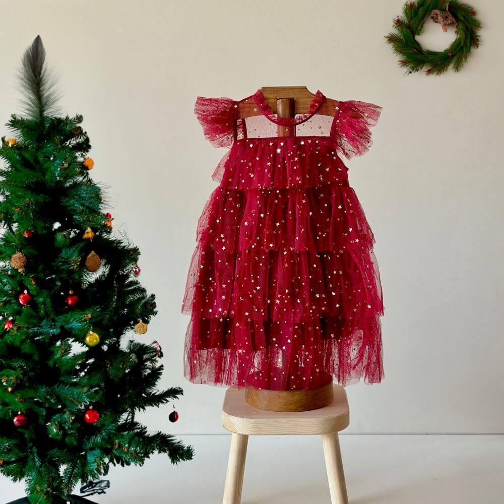 Featuring a vibrant, deep red tulle adorned with golden star accents, creating a festive look that’s perfect for special occasions. The tiered, ruffled layers add volume while the delicate flutter sleeves and sheer neckline bring extra beauty. This dress is sure to make any little one feel like the star of the celebration.