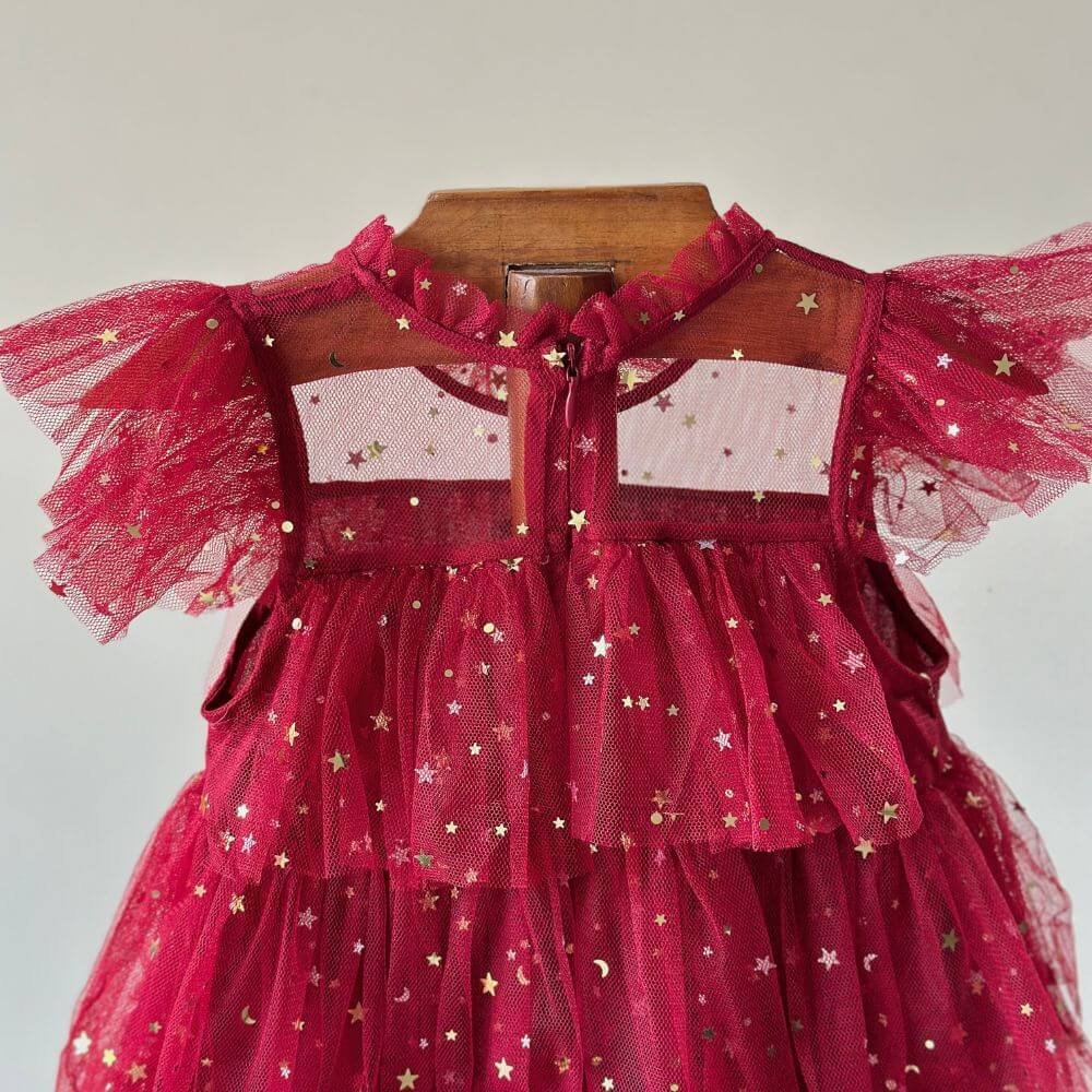 Featuring a vibrant, deep red tulle adorned with golden star accents, creating a festive look that’s perfect for special occasions. The tiered, ruffled layers add volume while the delicate flutter sleeves and sheer neckline bring extra beauty. This dress is sure to make any little one feel like the star of the celebration.