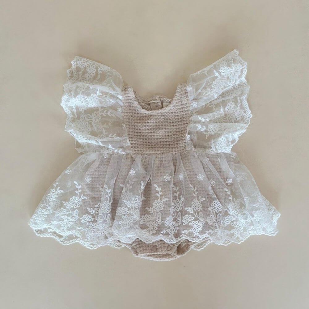 Evelyn romper crafted from premium waffle cotton, this dress combines the comfort of a romper with the sophistication of lace design. The intricately embroidered flower lace adds a simple elegance to the overall classic appeal.