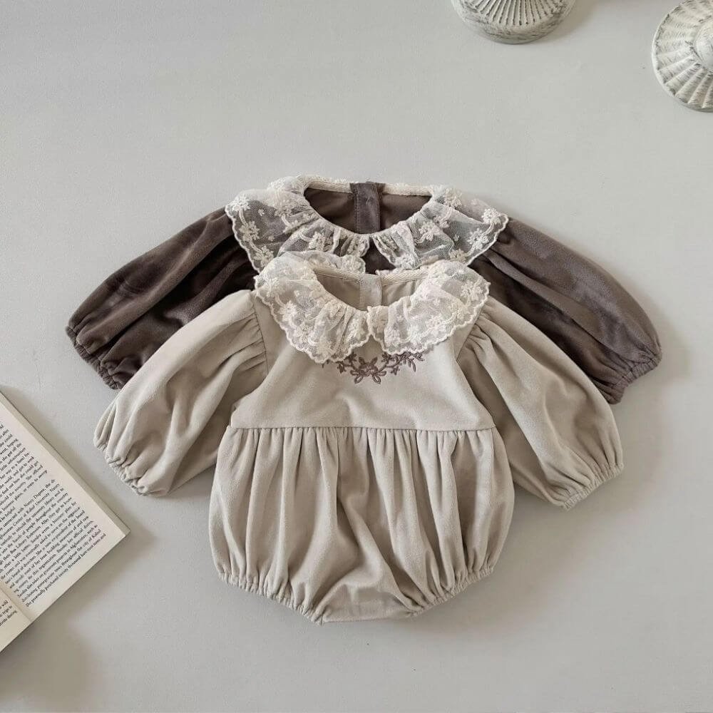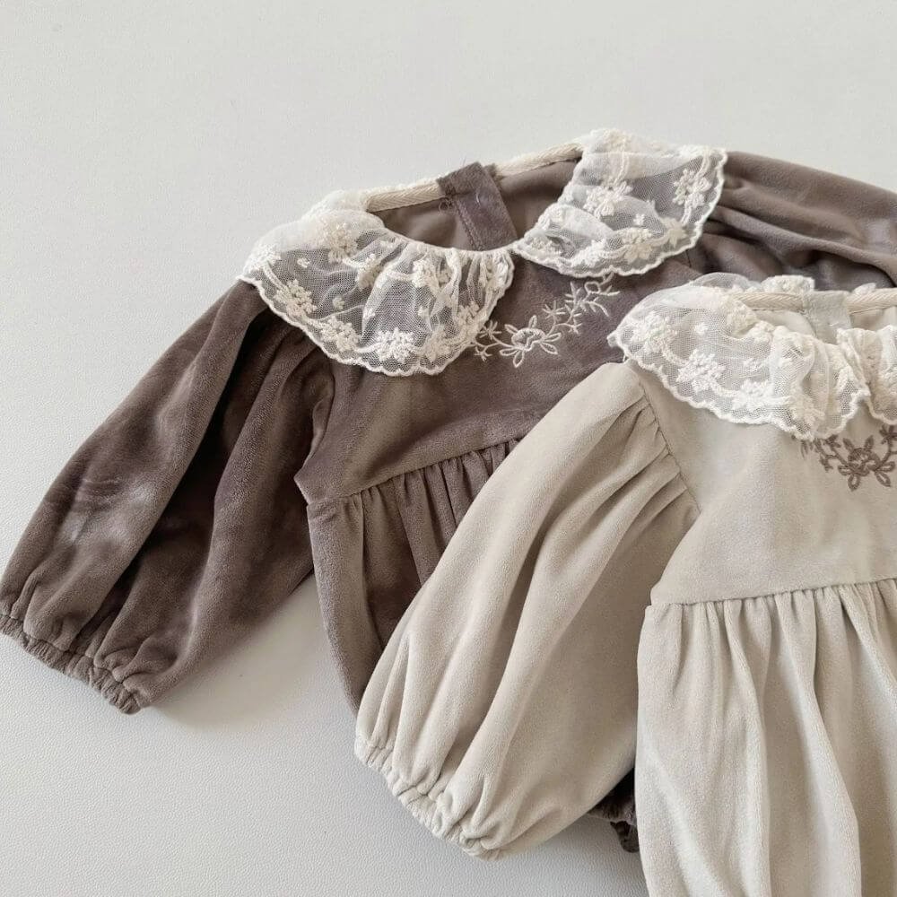 Crafted from luxurious velvet fabric, this beautiful romper features intricate embroidered details and a delicate lace collar. The long sleeves bring an extra layer of warmth and style making it a standout addition to your little one’s wardrobe. Measurement – (0-6M Chest-26cm, length 36cm) | (6-12M Chest-28cm, Length-38cm)