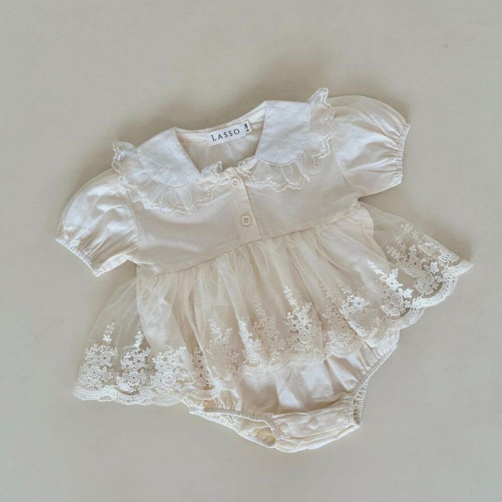 This beautiful romper with its soft lace detailing and creamy color adds elegance to any event. While delicate soft material promises comfort and versatile, it’s perfect for cake smash, baptism, and more.