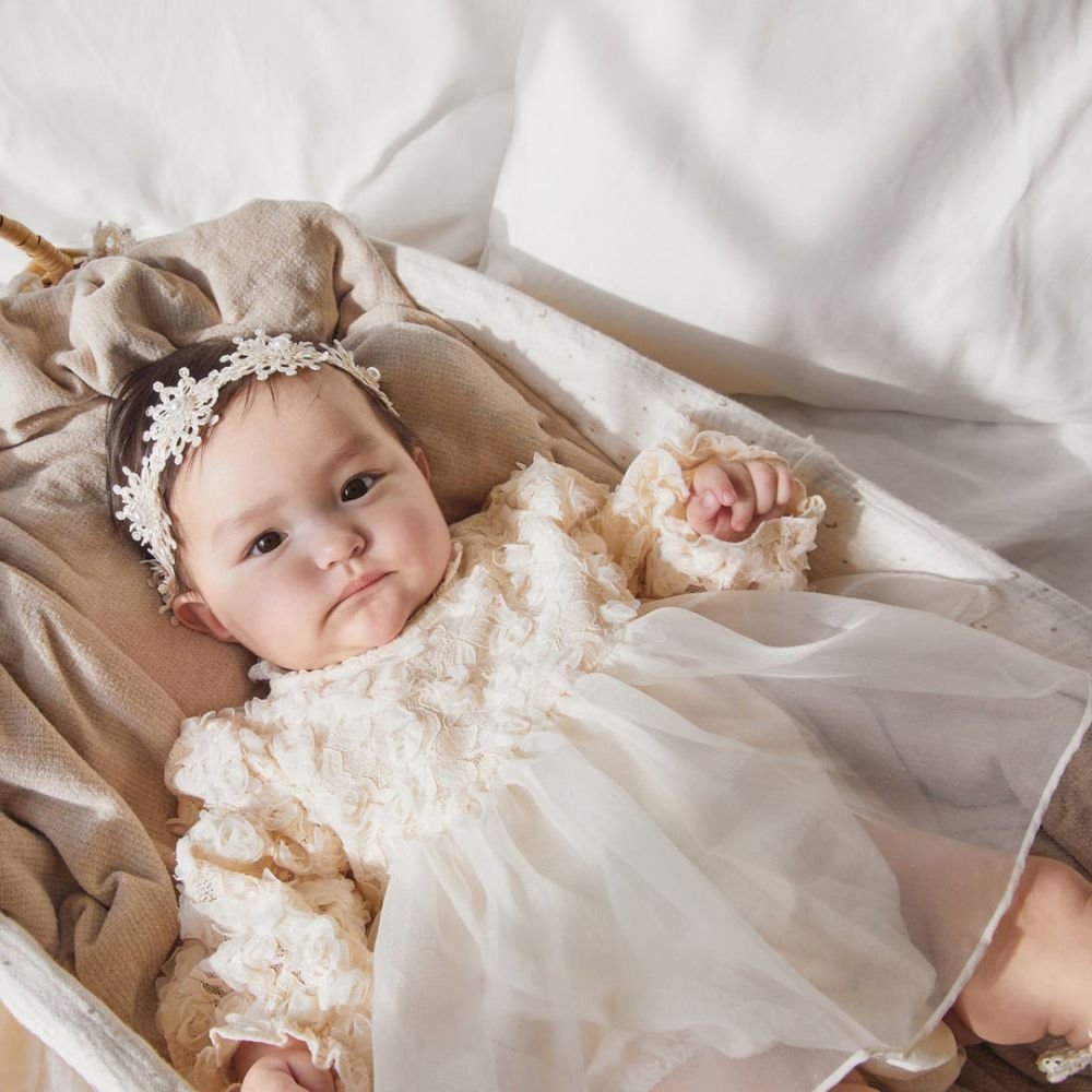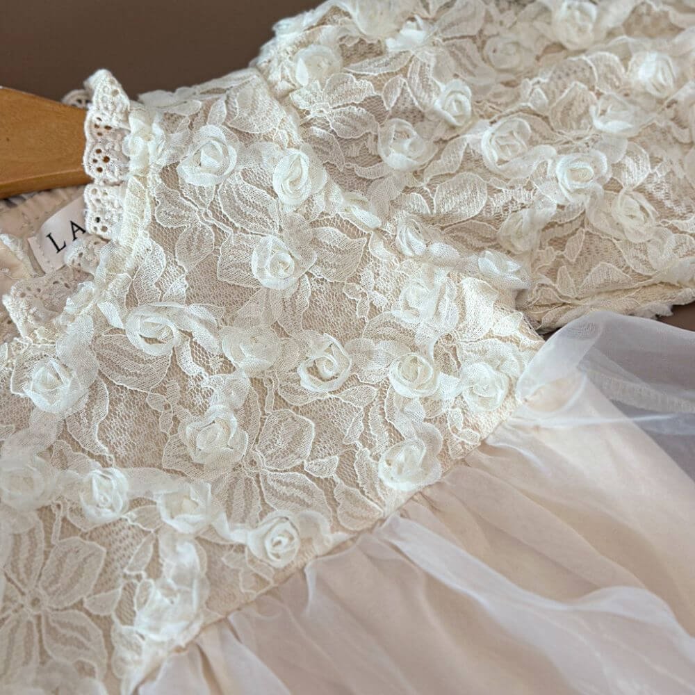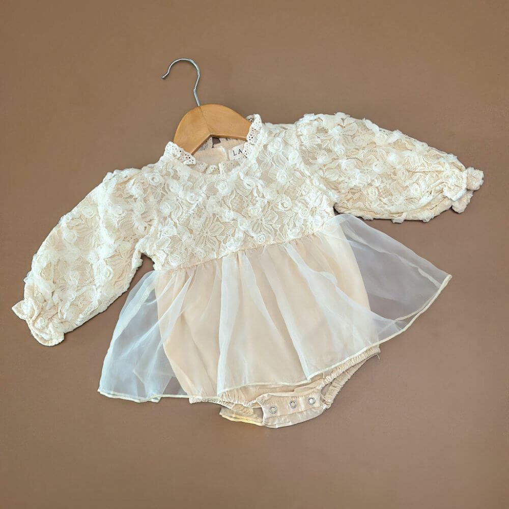 Introducing the Kirby romper, Adorned with delicate lace flowers, making it ideal for birthdays, cake smashes, or any special occasion. Made from soft, breathable fabric, ensures your baby stays comfortable while looking adorable. It’s a perfect addition to any baby’s wardrobe, combining charm with convenience.