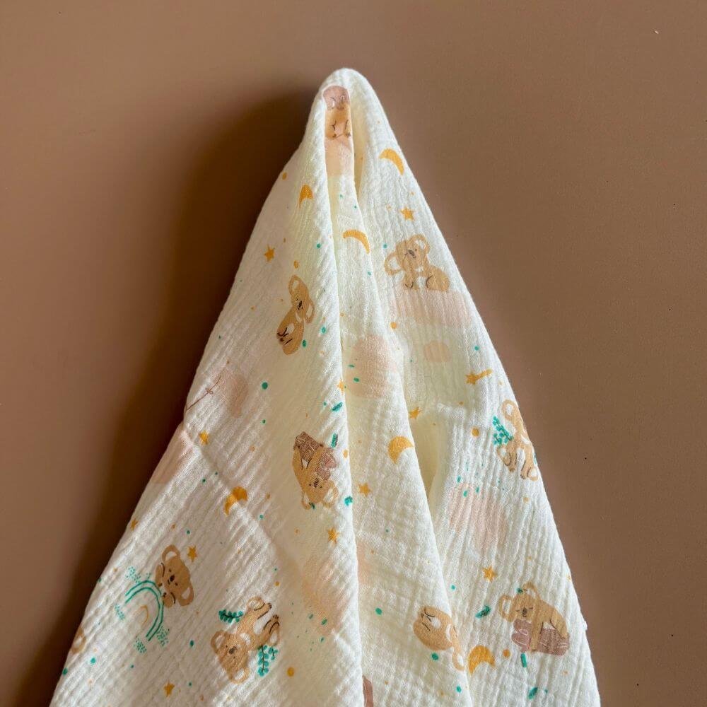 Drift into dreamland with our ultra-soft muslin swaddle, featuring adorable koalas, twinkling stars, and sleepy moons. Made from breathable, lightweight cotton muslin, it’s gentle on your baby’s delicate skin and perfect for cozy cuddles, nap time, or on-the-go snuggles. (SIZE 80*80 cm)