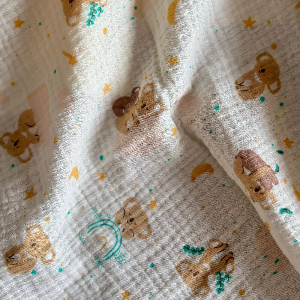 Drift into dreamland with our ultra-soft muslin swaddle, featuring adorable koalas, twinkling stars, and sleepy moons. Made from breathable, lightweight cotton muslin, it’s gentle on your baby’s delicate skin and perfect for cozy cuddles, nap time, or on-the-go snuggles. (SIZE 80*80 cm)
