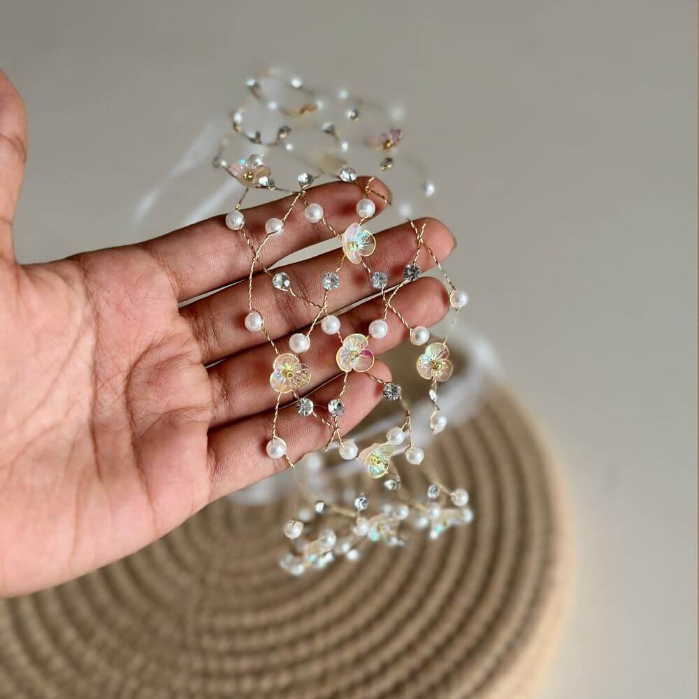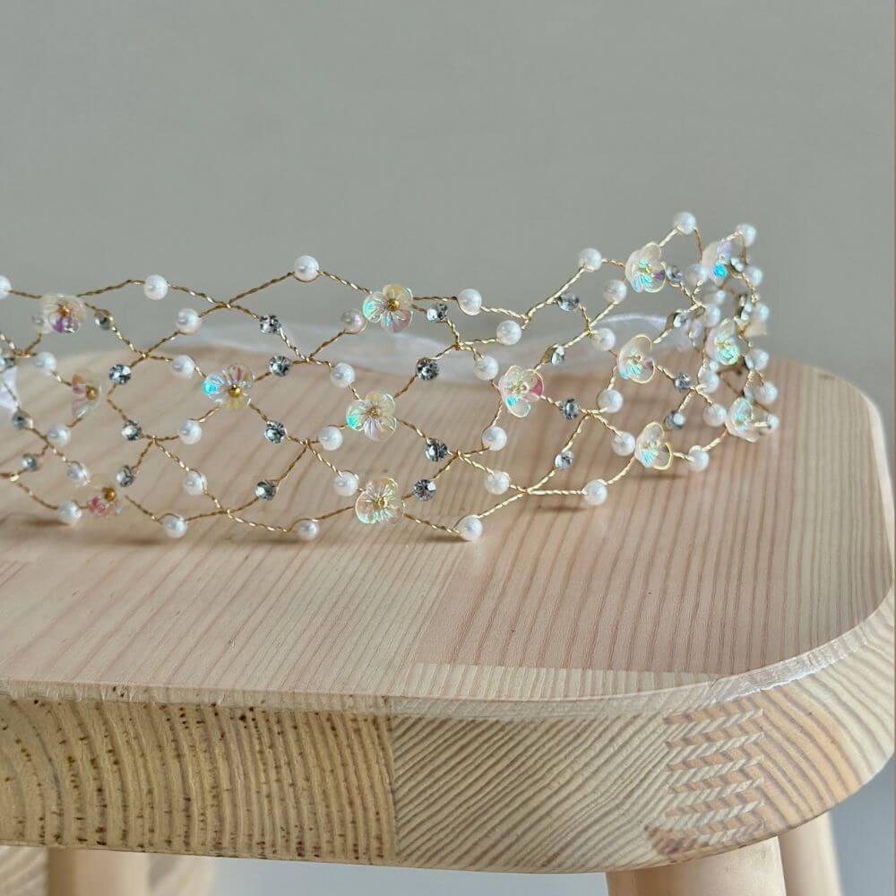 This delicate tiara features intricate crystal glass flowers and shimmering glass pearls, designed to add a graceful glow to any hairstyle. The soft tie-back closure ensures a perfect fit, making it both beautiful and comfortable to wear. Ideal for special occasions, photo shoots, or simply adding a touch of magic to your little one’s day.