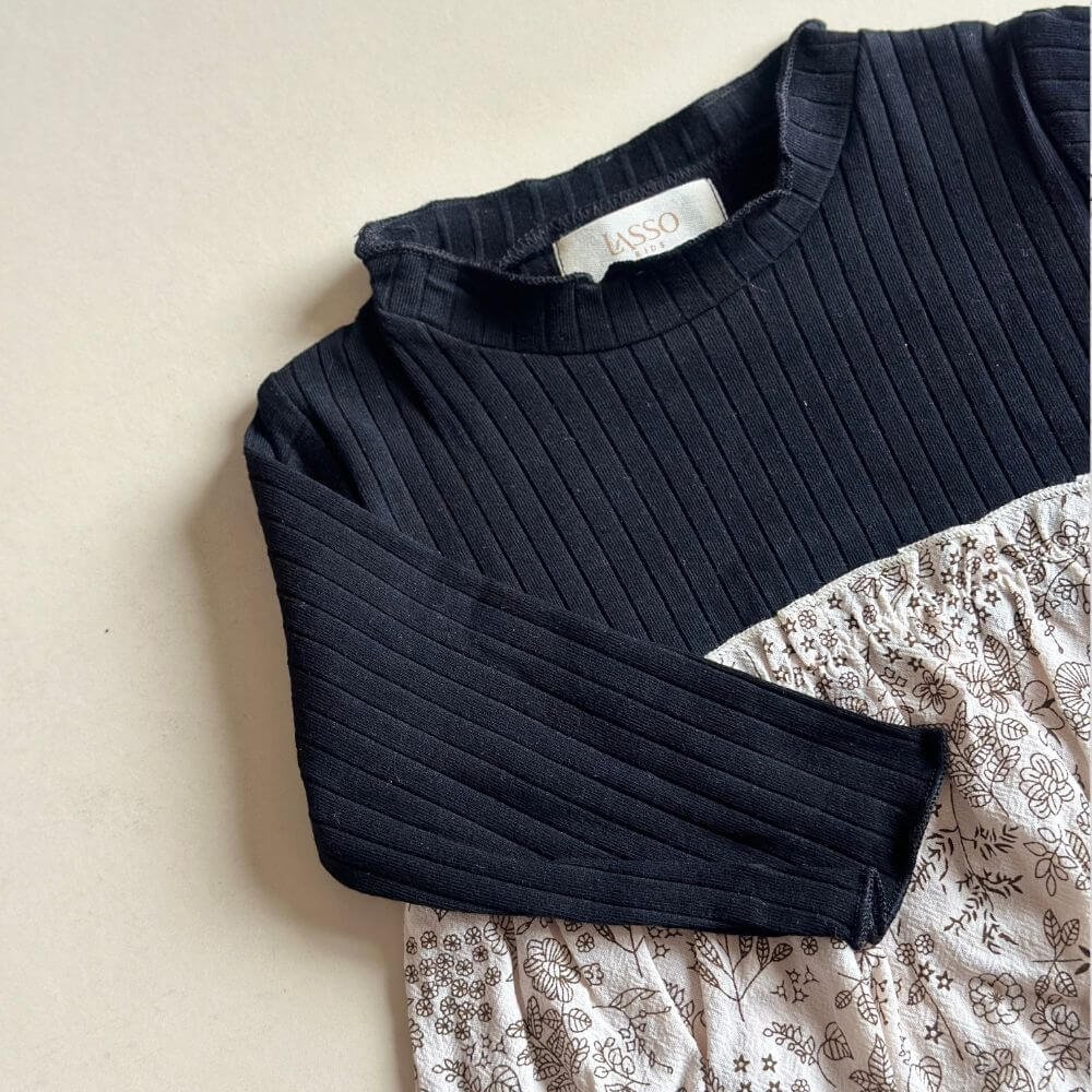 This adorable black and white floral dress features a black yoke with white trim, puffy sleeves, and a classic floral pattern. The dress is made of lightweight material, ensuring comfort and ease of movement. It comes with a hair hoop.