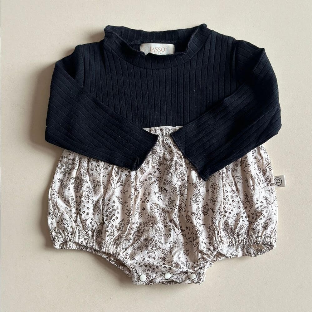 A charming romper featuring a beautiful floral pattern, perfect for your little one. Designed with long sleeves and a round neckline, this piece is elevated with delicate ruffle detailing around the collar and chest, adding a touch of timeless elegance.