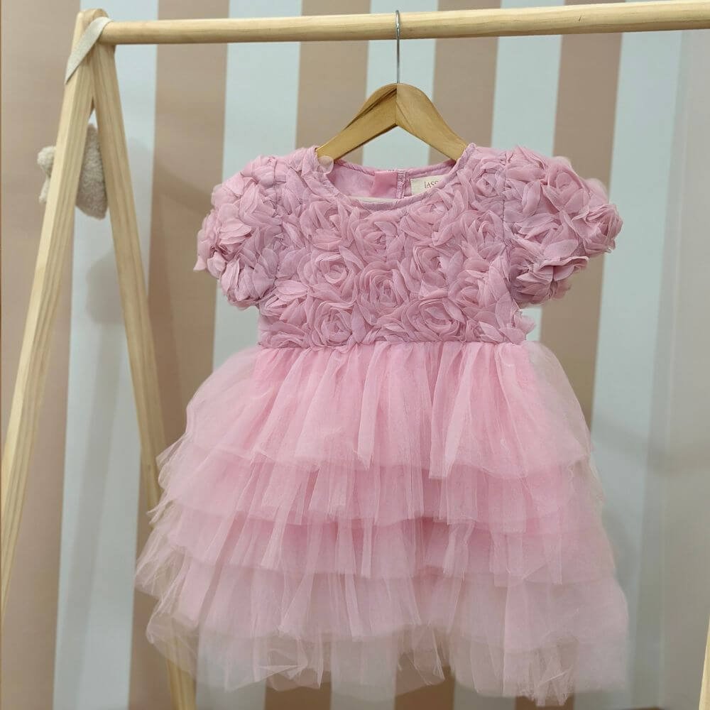 The Rosette Dress is a charming blend of elegance and whimsy. Featuring a beautifully textured bodice adorned with delicate 3D rosettes and a layered tulle skirt that flows with grace, this dress is perfect for birthdays, photo shoots, and special occasions.