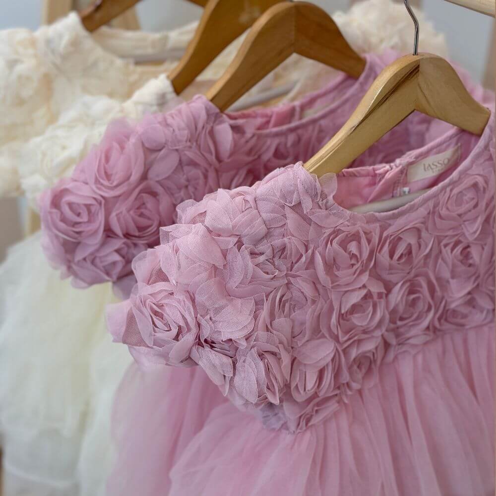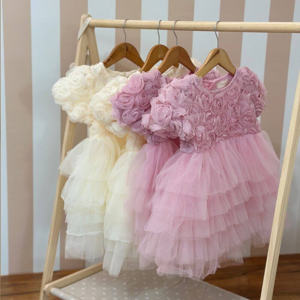 The Rosette Dress is a charming blend of elegance and whimsy. Featuring a beautifully textured bodice adorned with delicate 3D rosettes and a layered tulle skirt that flows with grace, this dress is perfect for birthdays, photo shoots, and special occasions.